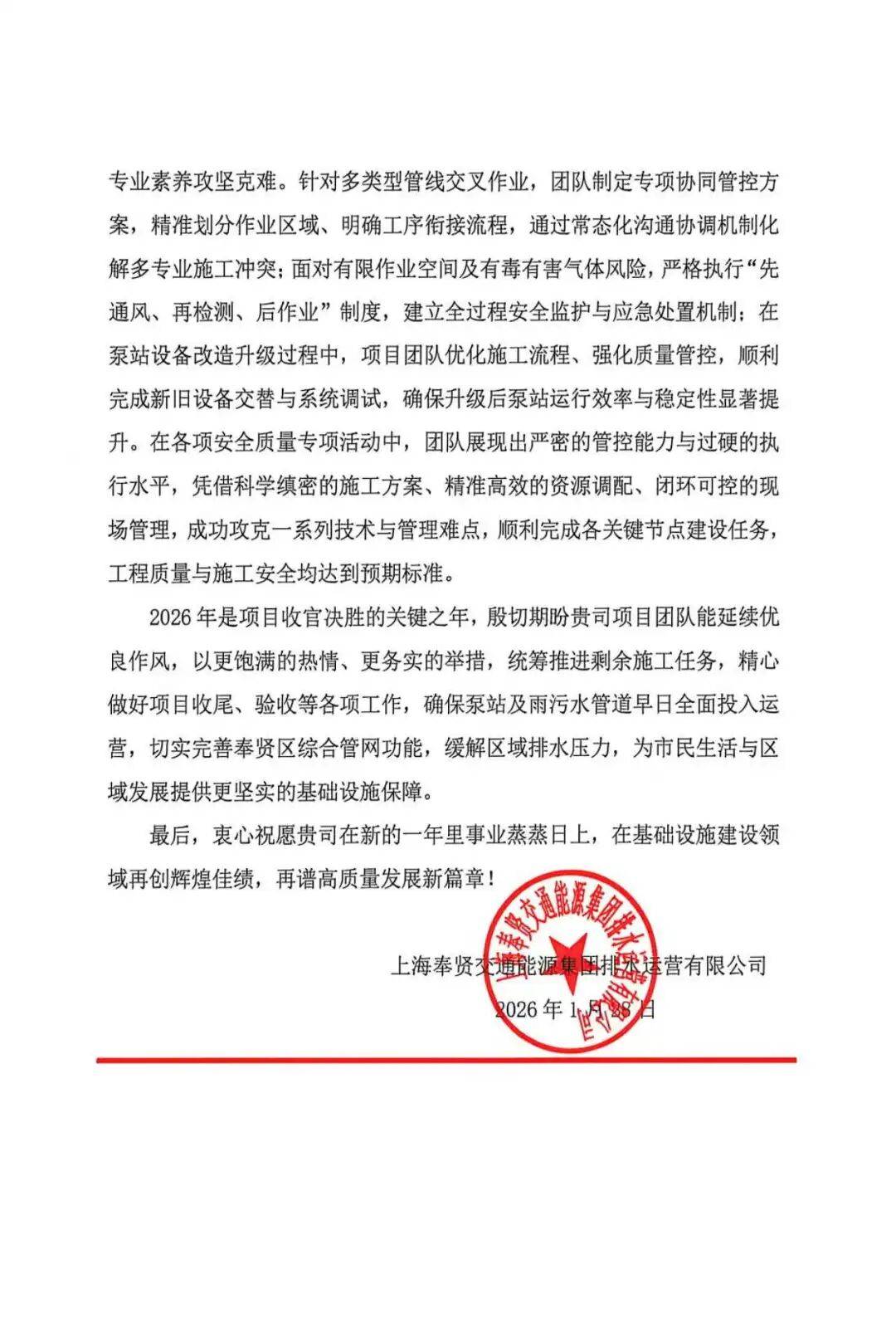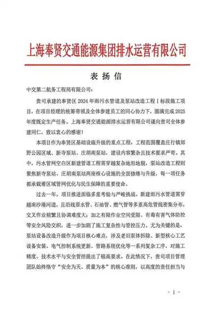近日,奉贤区2024年雨污水管道及泵站改造工程项目,收到业主上海奉贤交通能源集团排水运营有限公司的表扬信,信中高度赞扬了项目团队攻坚克难、圆满完成2025年度生产任务,并向全体参建员工致以衷心感谢,彰显了业主对项目建设成果的认可及项目团队的信任。